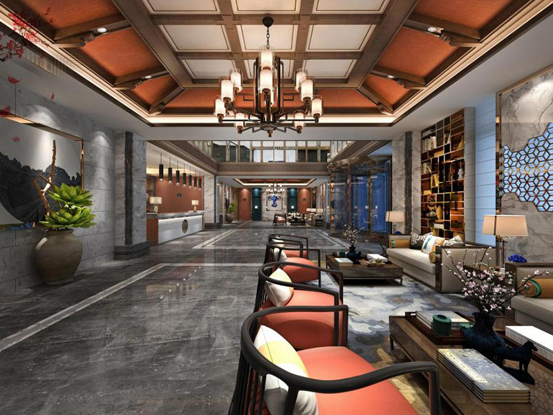 本案设计为酒店大堂空间,整体意境简雅,古典与现代的完美融合,容纳天地古今,过去与未来、人文与地理。空间与情感的共鸣,在此演绎传承。酒店入口设计独具匠心,将动感的几何变化整合于建筑整体平衡、内敛的语言之中,凸显出优雅与前卫兼备的整体形象。